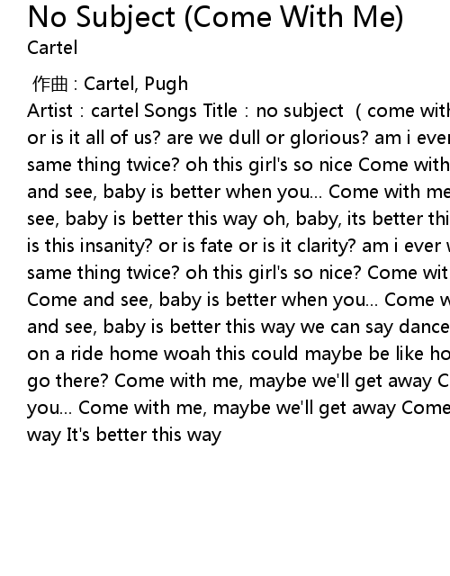 | [00:01.41] | Artist:cartel Songs Title:no subject (come with me) is it me or is it all of us? are we dull or glorious? am i ever waiting? or is it the same thing twice? oh this girl's so nice Come with me, maybe we'll get away Come and see, baby is better when you... Come with me, maybe we'll get away Come and see, baby is better this way oh, baby, its better this way well, is this real or is this insanity? or is fate or is it clarity? am i ever waiting? or is it the same thing twice? oh this girl's so nice? Come with me, maybe we'll get away Come and see, baby is better when you... Come with me, maybe we'll get away Come and see, baby is better this way we can say dance with me then out we're waiting on a ride home woah this could maybe be like home maybe we can go there, can we go there? Come with me, maybe we'll get away Come and see, baby is better when you... Come with me, maybe we'll get away Come and see, baby it's better this way It's better this way |