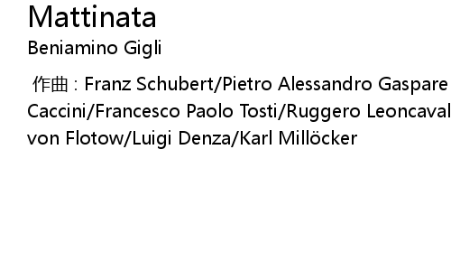 | [00:00.000] | 作曲 : Franz Schubert/Pietro Alessandro Gaspare Scarlatti/Giulio Caccini/Francesco Paolo Tosti/Ruggero Leoncavallo/Giovanni Bononcini/Friedrich von Flotow/Luigi Denza/Karl Millöcker |