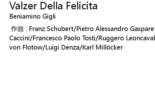 | [00:00.000] | 作曲 : Franz Schubert/Pietro Alessandro Gaspare Scarlatti/Giulio Caccini/Francesco Paolo Tosti/Ruggero Leoncavallo/Giovanni Bononcini/Friedrich von Flotow/Luigi Denza/Karl Millöcker |
