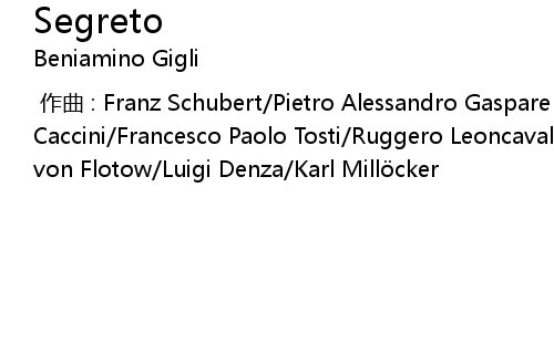 | [00:00.000] | 作曲 : Franz Schubert/Pietro Alessandro Gaspare Scarlatti/Giulio Caccini/Francesco Paolo Tosti/Ruggero Leoncavallo/Giovanni Bononcini/Friedrich von Flotow/Luigi Denza/Karl Millöcker |