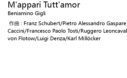| [00:00.000] | 作曲 : Franz Schubert/Pietro Alessandro Gaspare Scarlatti/Giulio Caccini/Francesco Paolo Tosti/Ruggero Leoncavallo/Giovanni Bononcini/Friedrich von Flotow/Luigi Denza/Karl Millöcker |