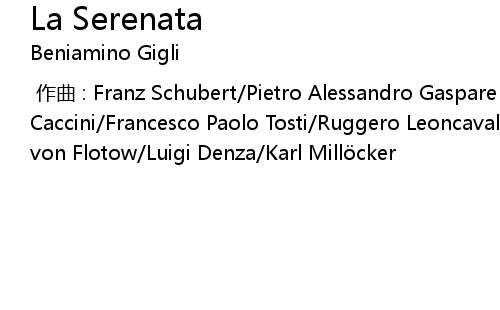 | [00:00.000] | 作曲 : Franz Schubert/Pietro Alessandro Gaspare Scarlatti/Giulio Caccini/Francesco Paolo Tosti/Ruggero Leoncavallo/Giovanni Bononcini/Friedrich von Flotow/Luigi Denza/Karl Millöcker |