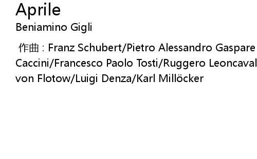 | [00:00.000] | 作曲 : Franz Schubert/Pietro Alessandro Gaspare Scarlatti/Giulio Caccini/Francesco Paolo Tosti/Ruggero Leoncavallo/Giovanni Bononcini/Friedrich von Flotow/Luigi Denza/Karl Millöcker |