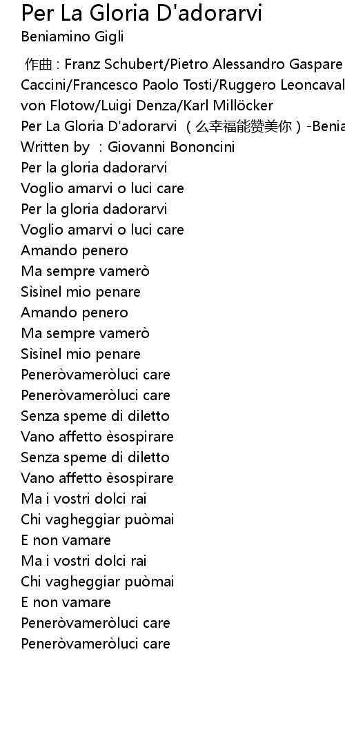 | [00:00.00] | Per La Gloria D'adorarvi (么幸福能赞美你)-Beniamino Gigli |