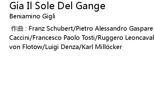 | [00:00.000] | 作曲 : Franz Schubert/Pietro Alessandro Gaspare Scarlatti/Giulio Caccini/Francesco Paolo Tosti/Ruggero Leoncavallo/Giovanni Bononcini/Friedrich von Flotow/Luigi Denza/Karl Millöcker |
