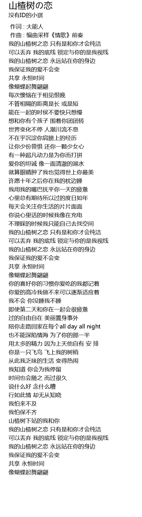 | [00:24.104] | wǒ de shān zhā shù zhī liàn yǒng yuǎn zhàn zài nǐ de shēn biān |