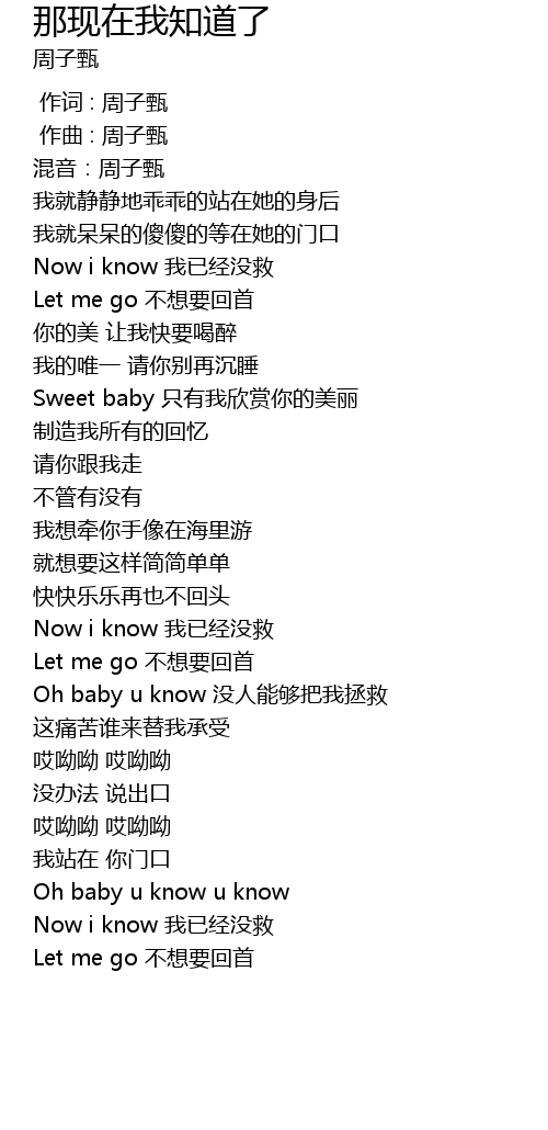 | [00:23.630] | Now i know wo yi jing mei jiu |