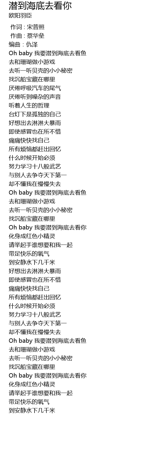 | [00:14.29] | Oh baby 我要潜到海底去看鱼 |