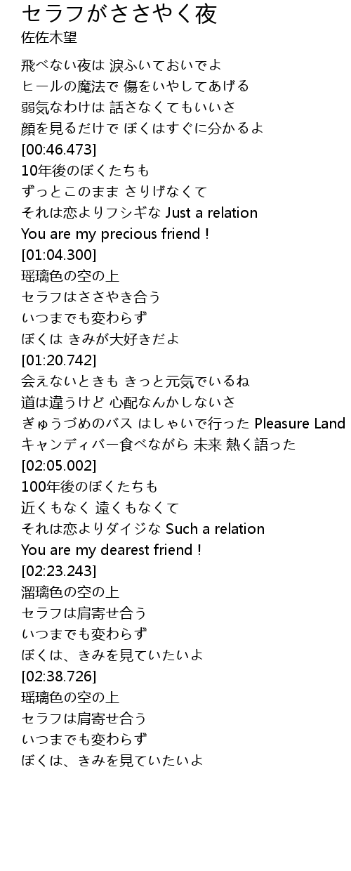 | [00:54.463] | それは恋よりフシギな Just a relation |