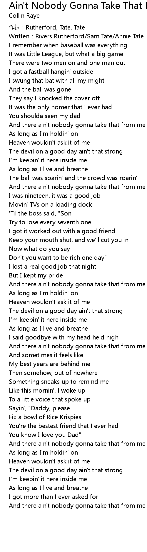 | And there ain' t nobody gonna take that from me | |