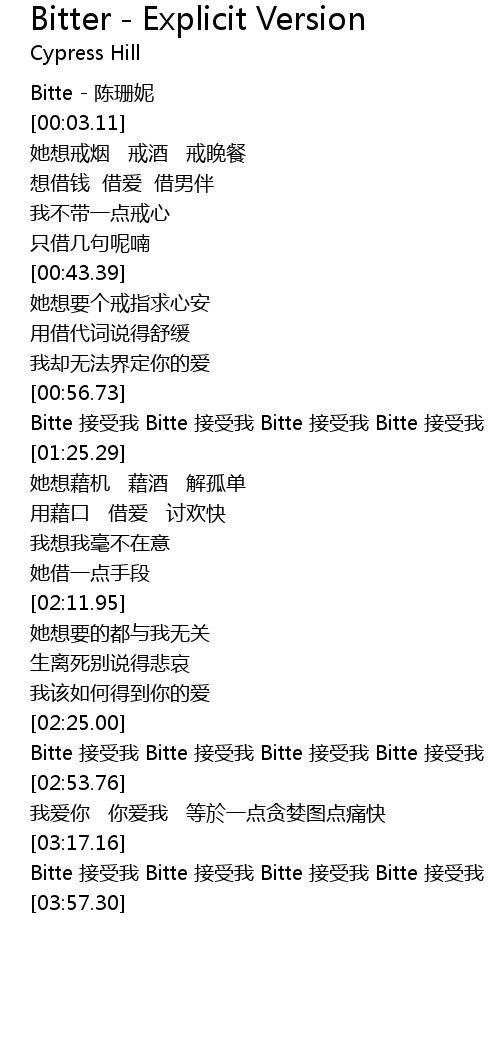 | [03:28.52] | Bitte jiē shòu wǒ Bitte jiē shòu wǒ Bitte jiē shòu wǒ Bitte jiē shòu wǒ |