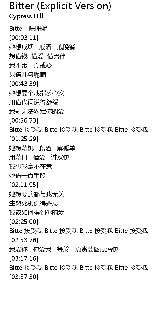 | [03:28.52] | Bitte jiē shòu wǒ Bitte jiē shòu wǒ Bitte jiē shòu wǒ Bitte jiē shòu wǒ |