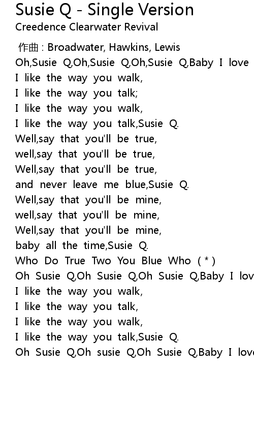 | [03:03.40] | Oh Susie Q, Oh Susie Q, Oh Susie Q, Baby I love you, Susie Q. |