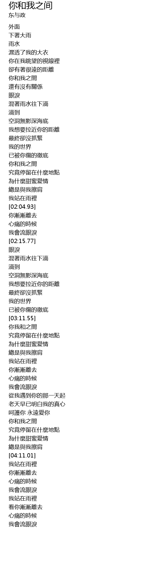 | [03:55.49] | nǐ hé wǒ zhī jiān |