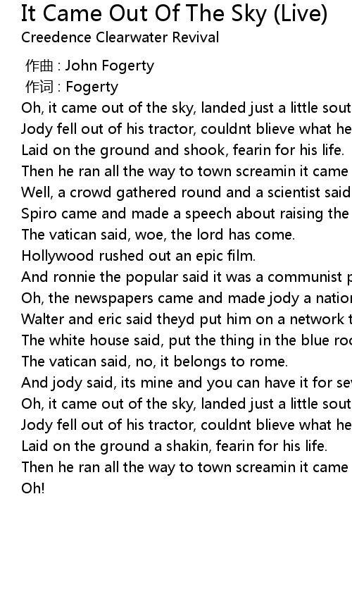 | [02:09.84] | Then he ran all the way to town screamin it came out of the sky. |