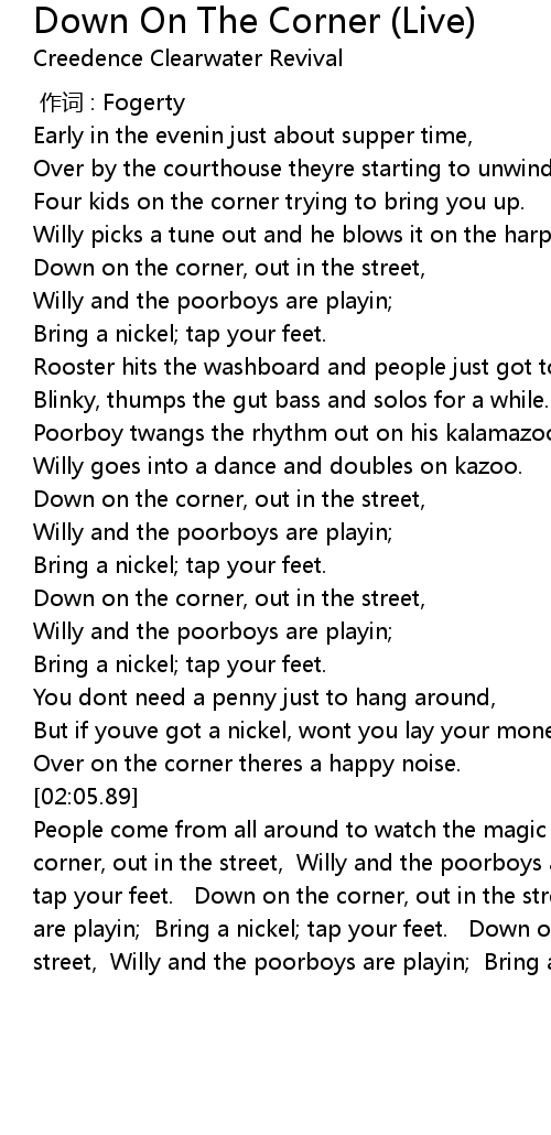 | [02:06.69] | People come from all around to watch the magic boy. Down on the corner, out in the street, Willy and the poorboys are playin Bring a nickel tap your feet. Down on the corner, out in the street, Willy and the poorboys are playin Bring a nickel tap your feet. Down on the corner, out in the street, Willy and the poorboys are playin Bring a nickel tap your feet. |