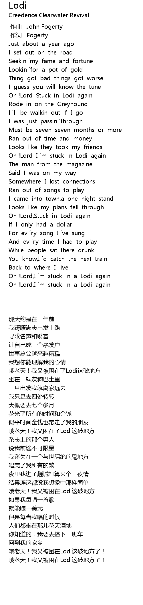 | [02:33.319] | Oh !Lord,I ´m stuck in a Lodi again |