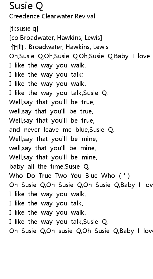 | [03:03.40] | Oh Susie Q, Oh Susie Q, Oh Susie Q, Baby I love you, Susie Q. |