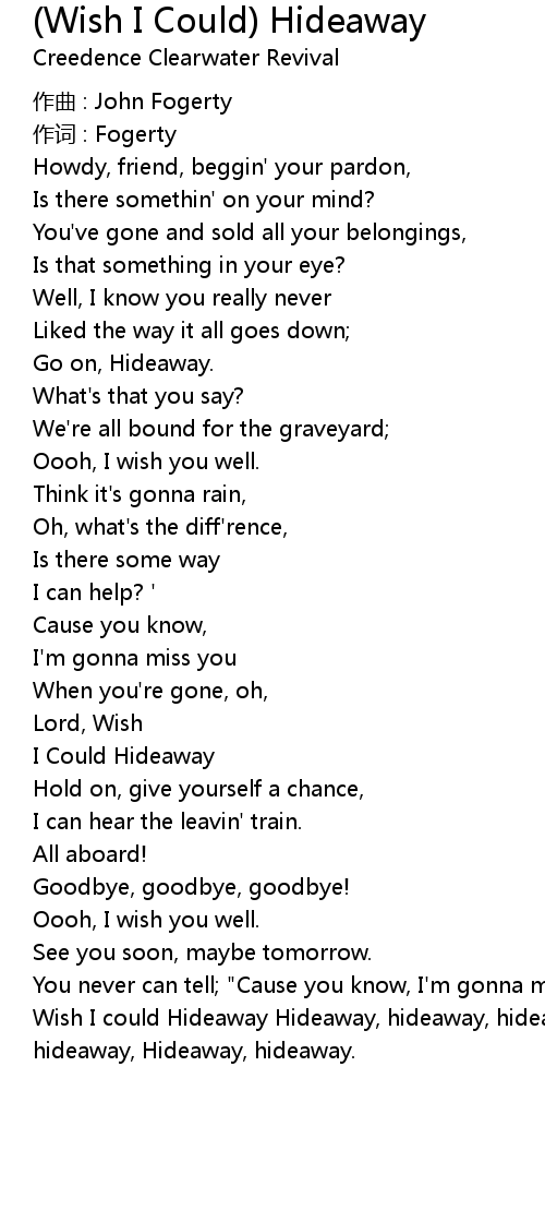 | You never can tell " Cause you know, I' m gonna miss you When you' re gone, oh, Wish I could Hideaway Hideaway, hideaway, hideaway, hideaway. Hideaway, hideaway, Hideaway, hideaway. |