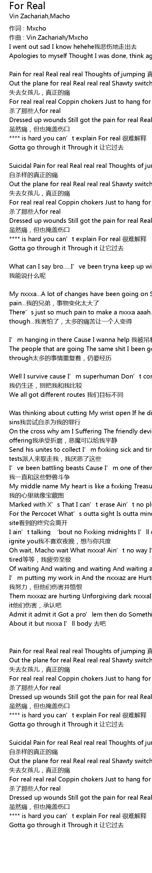 | For real real real Coppin chokers Just to hang for real real real shā le nèi xiē rén for real | |