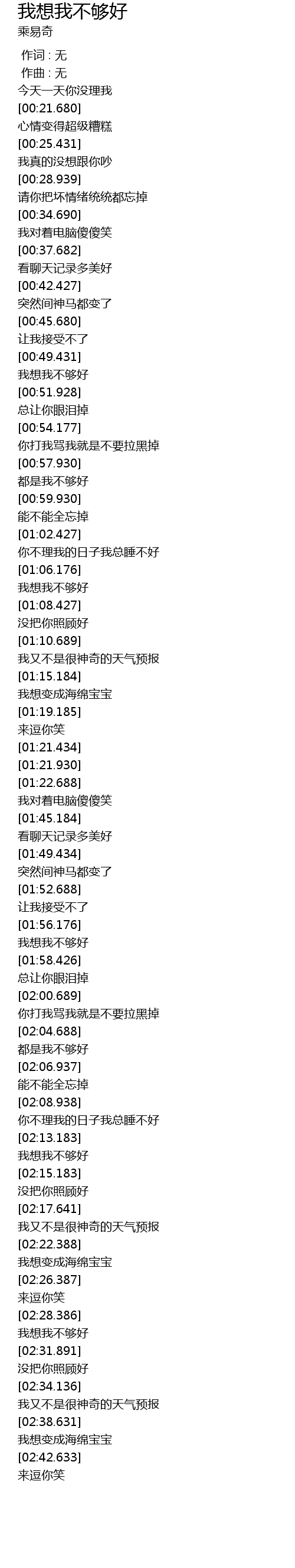 | [02:30.386] | wǒ xiǎng wǒ bù gòu hǎo |