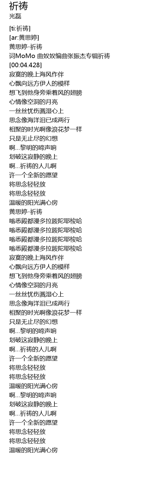 | [00:01.711] | 词MoMo 曲奴奴编曲张振杰专辑祈祷 |