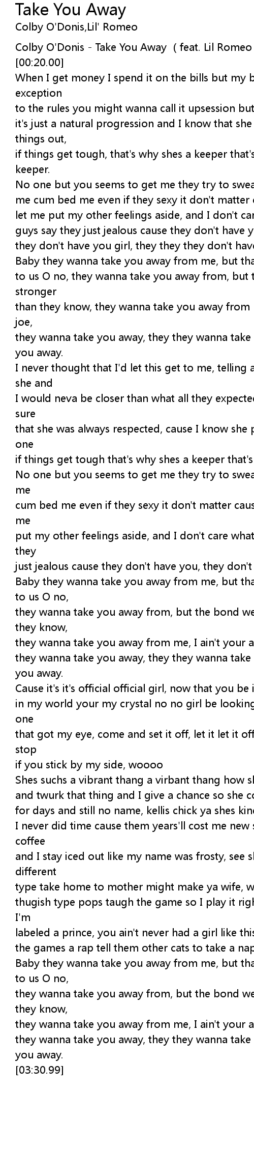 | [00:02.00] | Colby O'Donis - Take You Away (feat. Lil Romeo) |