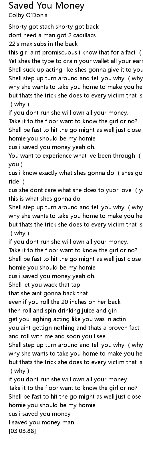 | [02:03.95] | cus i saved you money yeah oh. |
