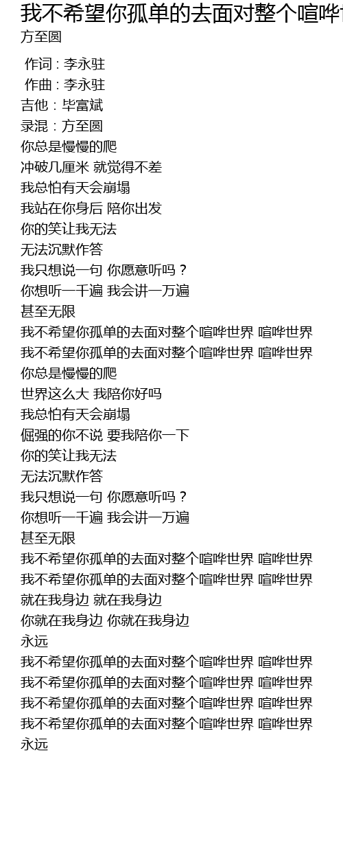 | Song | 我不希望你孤单的去面对整个喧哗世界 |