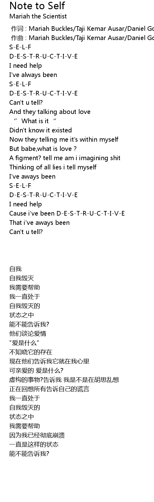 | [00:01.000] | 作曲 : Mariah Buckles/Taji Kemar Ausar/Daniel Gonzalez |