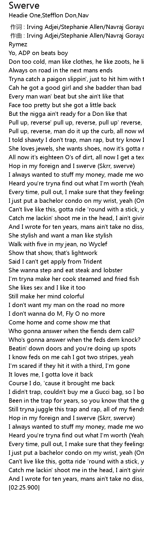 | [01:52.810] | Hop in my foreign and I swerve (Skrr, swerve) |