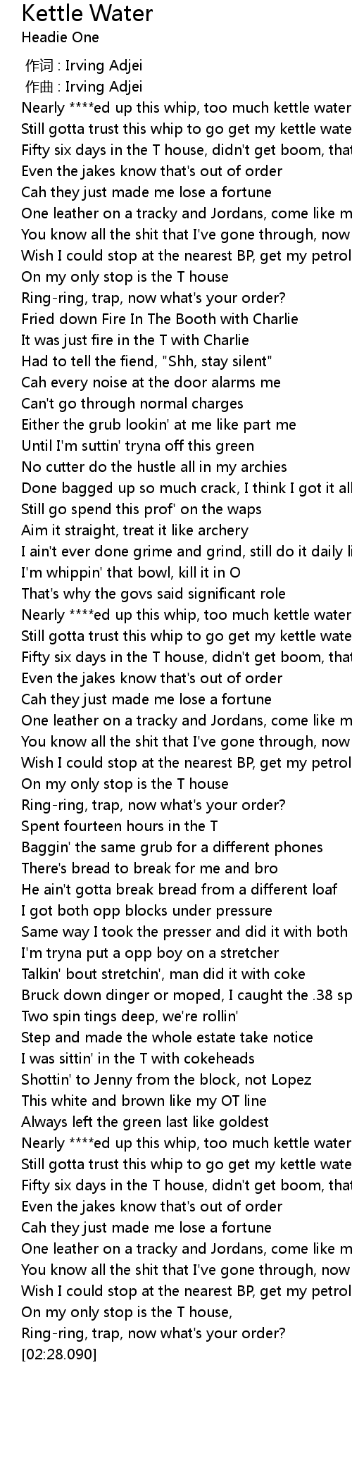 | [00:17.340] | Still gotta trust this whip to go get my kettle watered |