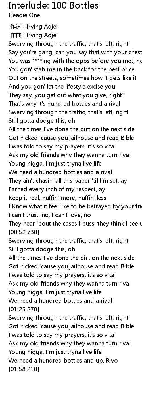 | [00:18.170] | That's why it's hundred bottles and a rival |