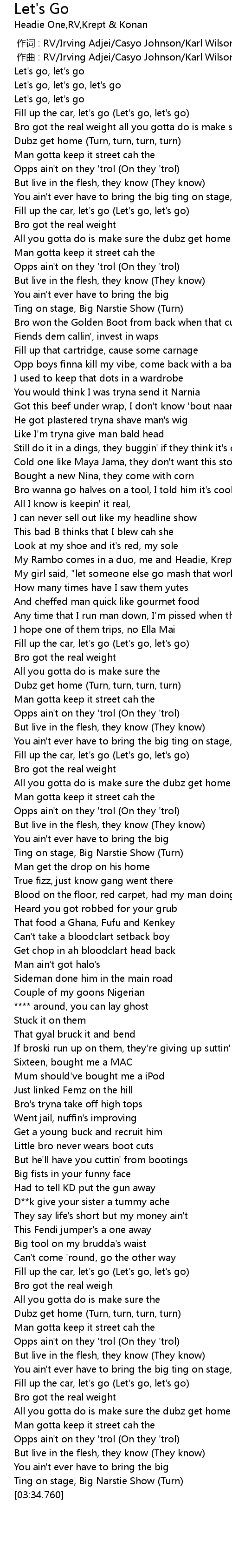 | [01:30.900] | My Rambo comes in a duo, me and Headie, Krept and Cones |