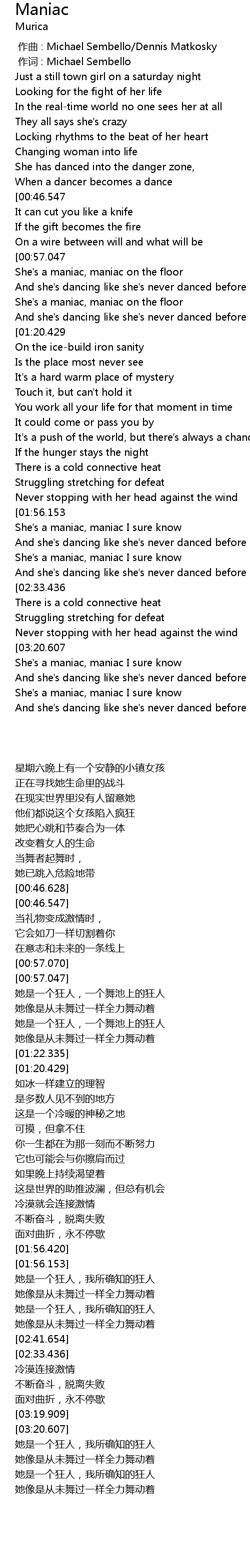 | [01:56.735] | She' s a maniac, maniac I sure know |