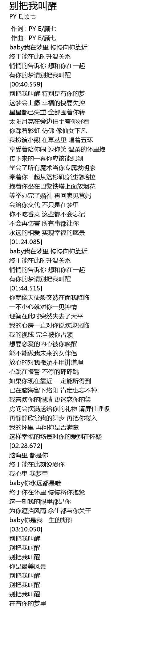 | [00:40.930] | bié bǎ wǒ jiào xǐng tè bié shì yǒu nǐ de mèng |