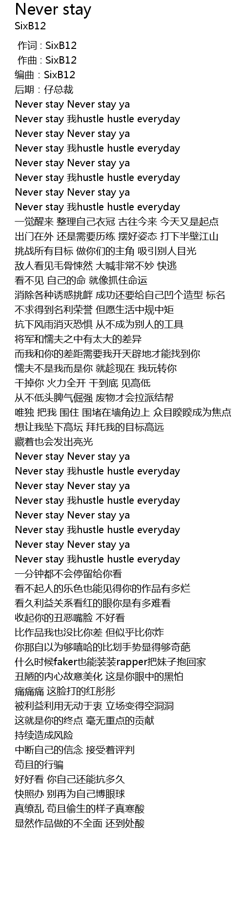 | [00:22.83] | Never stay 我hustle hustle everyday |