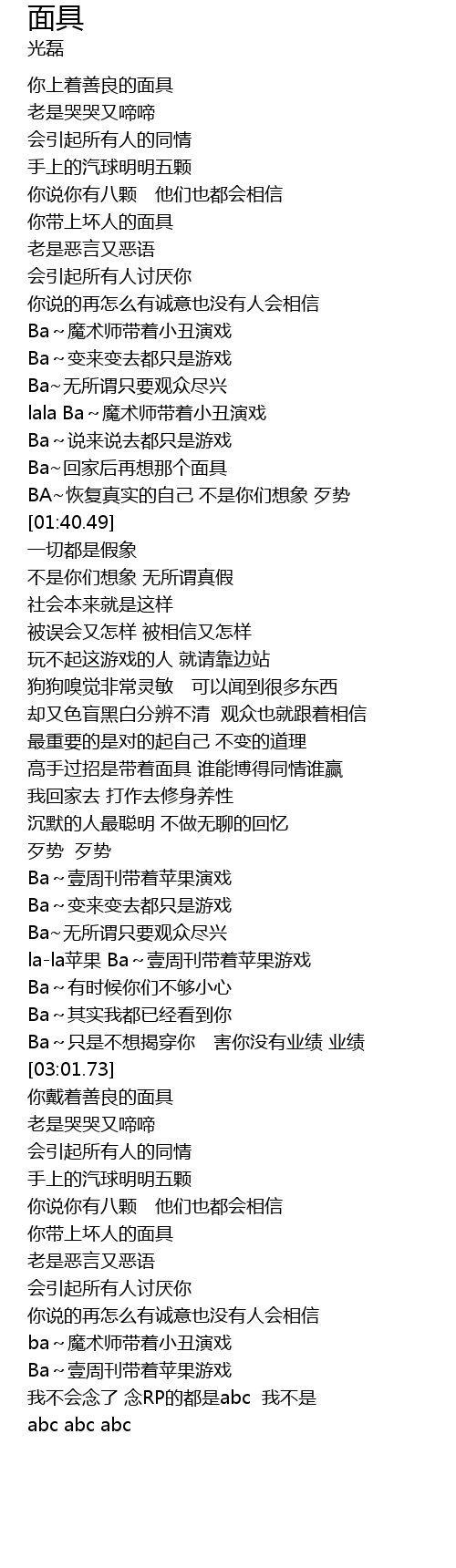 | [02:03.88] | 高手过招是带着面具 谁能博得同情谁赢 |