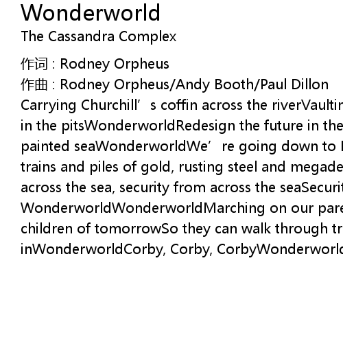| Carrying Churchill' s coffin across the riverVaulting on the backs of niggers in the pitsWonderworldRedesign the future in the pastDoing doggy paddles in a painted seaWonderworldWe' re going down to Memphis, riding on a railCollision trains and piles of gold, rusting steel and megadeathWonderworldSecurity from across the sea, security from across the seaSecurity come to comfort me in WonderworldWonderworldMarching on our parents' gravesMaking shoes for the children of tomorrowSo they can walk through trees and fields inWonderworldCorby, Corby, CorbyWonderworldWonderworld |