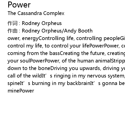 | ower, energyControlling life, controlling peopleGive me power, lots of itTo control my life, to control your lifePowerPower, coming from the speakerPower, coming from the bassCreating the future, creating machinesThat' s the power in your soulPowerPower, of the human animalStripping away the skin, reaching down, down to the boneDriving you upwards, driving you crazyThat' s powerPowerPower, call of the wildIt' s ringing in my nervous system, it' s crawling up my spineIt' s burning in my backbrainIt' s gonna be mine, it' s gonna be minePower |