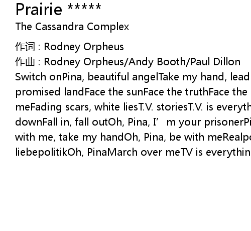 | Switch onPina, beautiful angelTake my hand, lead meAcross the sandTo the promised landFace the sunFace the truthFace the enemyOh, Pina, face the truth in meFading scars, white liesT. V. storiesT. V. is everythingI' m falling, falling downFall in, fall outOh, Pina, I' m your prisonerPina, beautiful alienDance with me, take my handOh, Pina, be with meRealpolitik, realpolitikLiebe, liebepolitikOh, PinaMarch over meTV is everything |