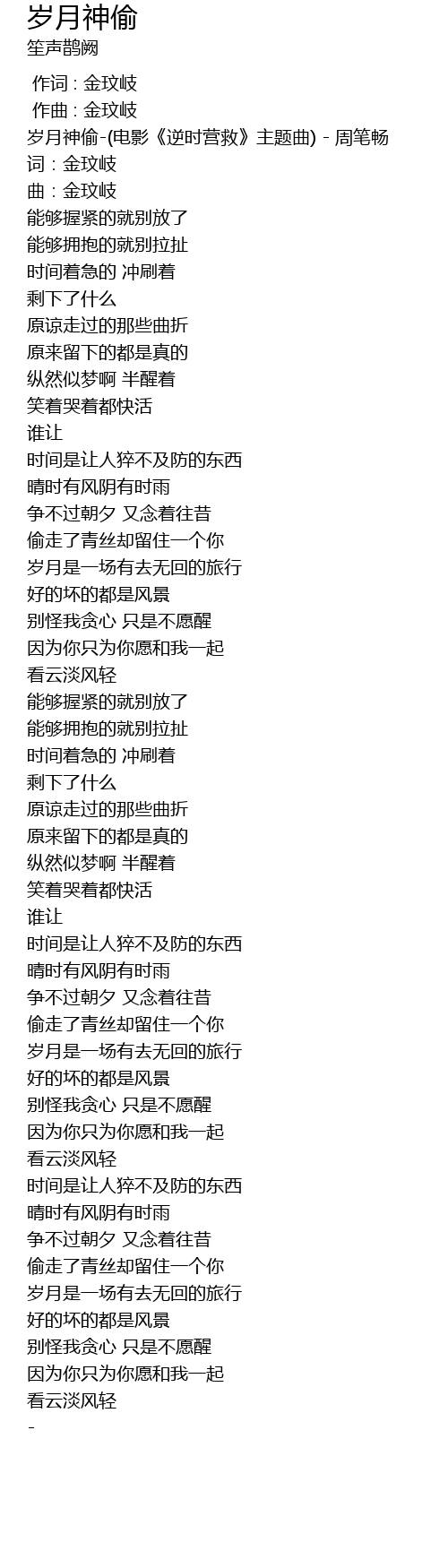 | [00:04.806] | 岁月神偷-(电影《逆时营救》主题曲) - 周笔畅 |