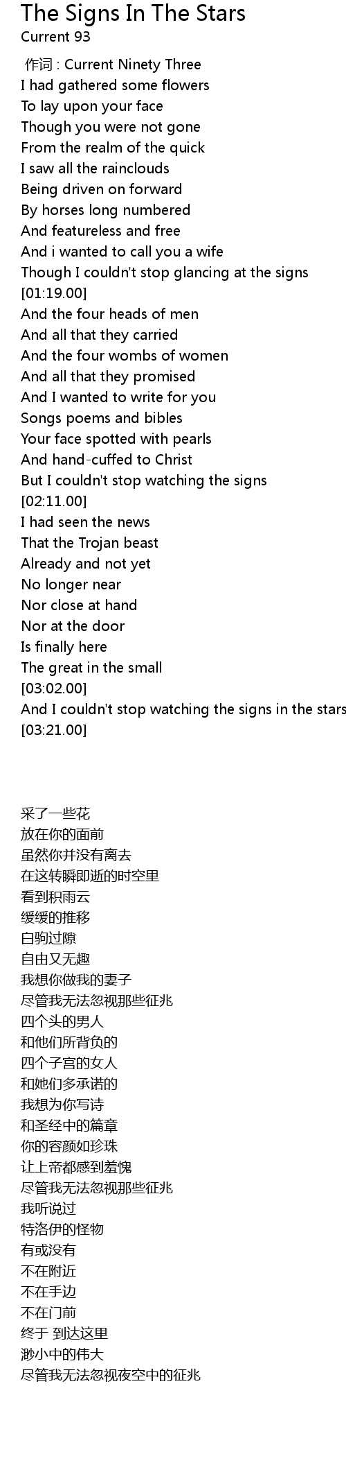 | [03:12.00] | And I couldn' t stop watching the signs in the stars |