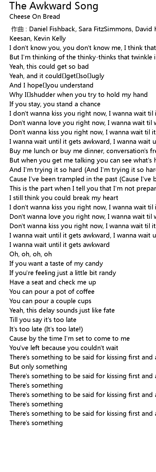 | [01:26.159] | I don' t wanna kiss you right now, I wanna wait til it gets awkward |