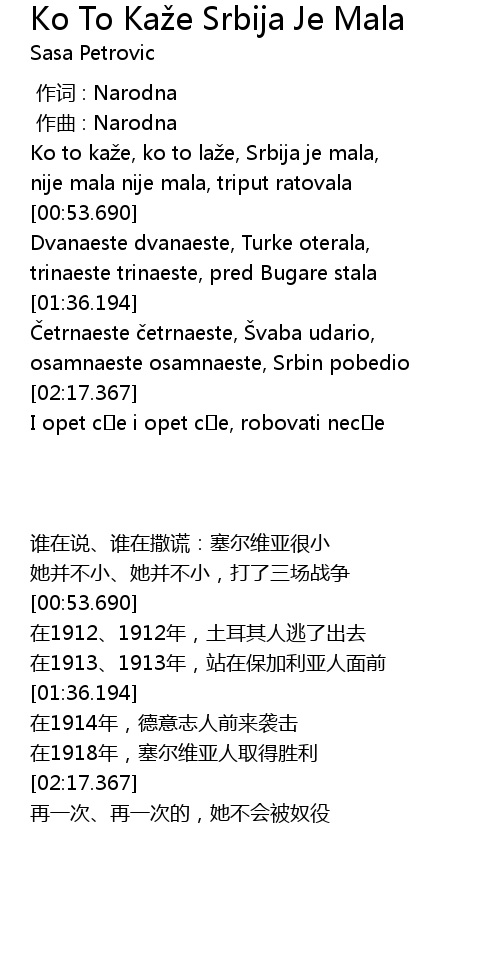 | [00:12.088] | Ko to ka e, ko to la e, Srbija je mala, |
