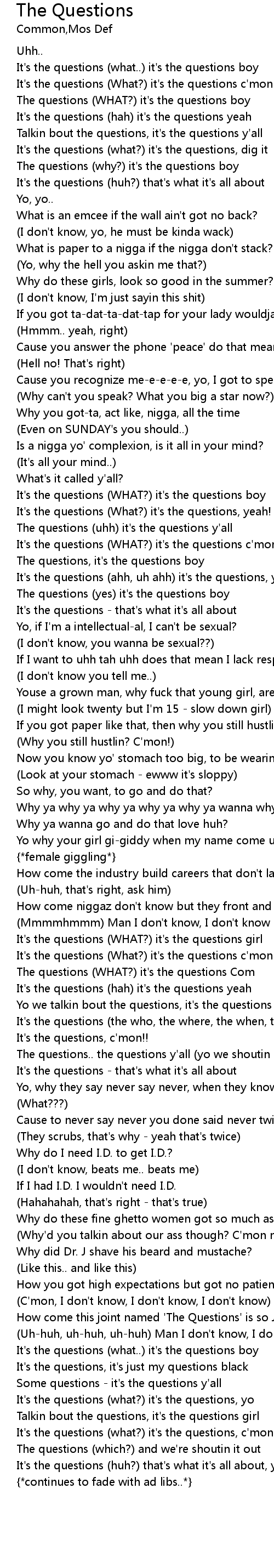| [00:11.51] | Talkin bout the questions, it's the questions y'all |
