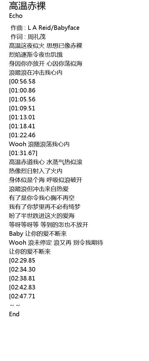 | [00:38.82] | 高温这夜似火 思想已像赤裸 |