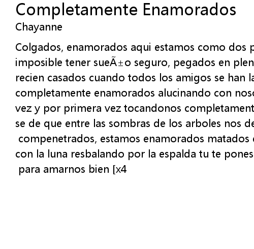 | Colgados, enamorados aqui estamos como dos perros sin due o esta noche es imposible tener sue o seguro, pegados en plena calle parecemos como dos recien casados cuando todos los amigos se han largado cansados coro completamente enamorados alucinando con nosotros dos sintiendo morbo por primera vez y por primera vez tocandonos completamente enamorados como borrachos yo no se de que entre las sombras de los arboles nos desvestimos para amarnos bien para amarnos bien x4 compenetrados, estamos enamorados matados de tanta risa con la luna resbalando por la espalda tu te pones mi camisa yo tu falda felices coro para amarnos bien x4 compenetrados, estamos enamorados coro |