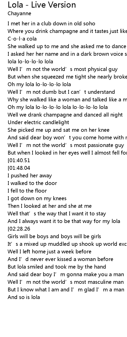 | [03:13.86][01:48.04] | Lola lo-lo-lo-lo lola lo-lo-lo-lo lola |