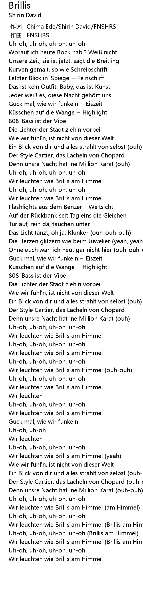 | [02:00.35] | Wir leuchten wie Brillis am Himmel (ouh-ouh) |